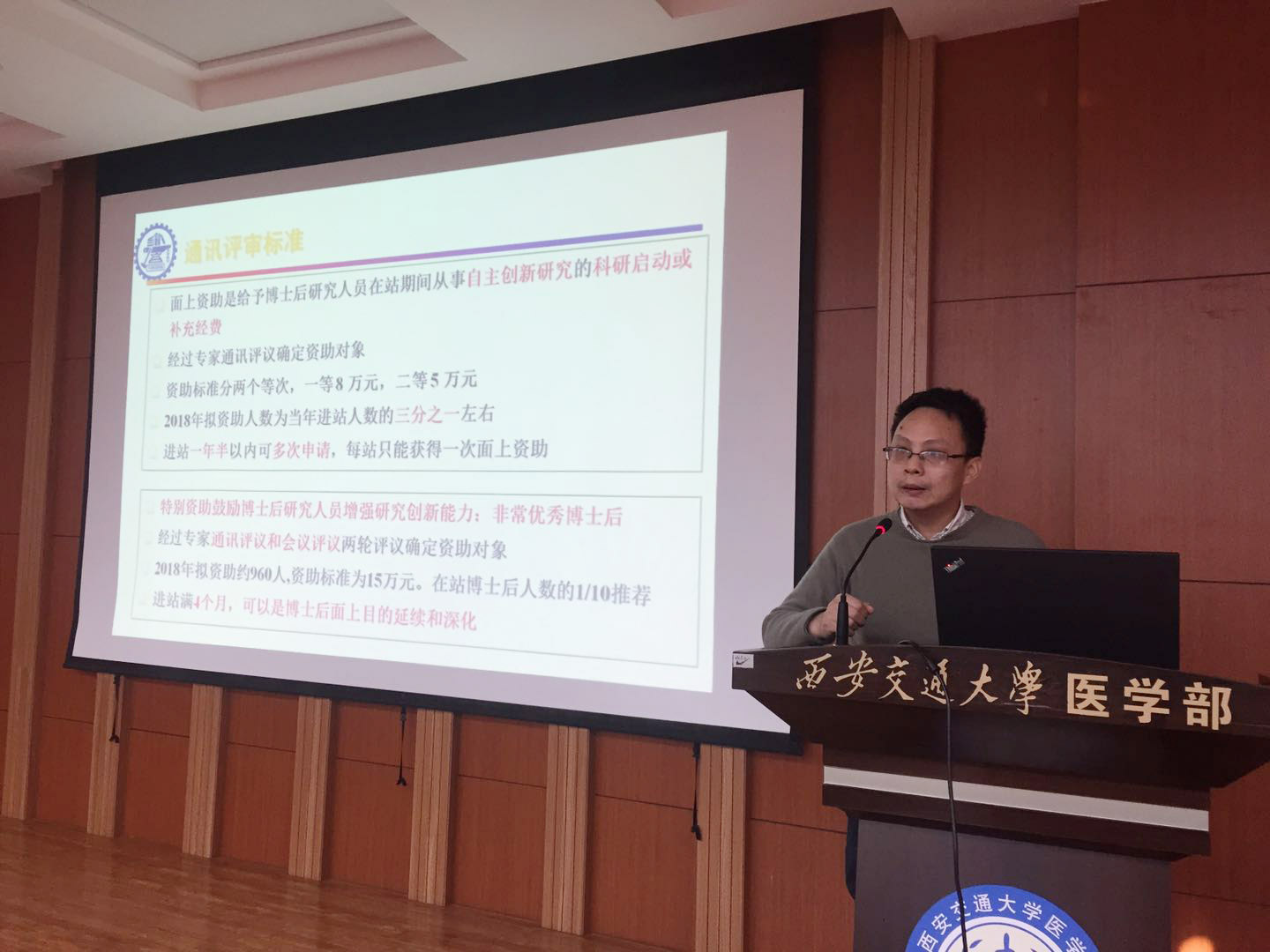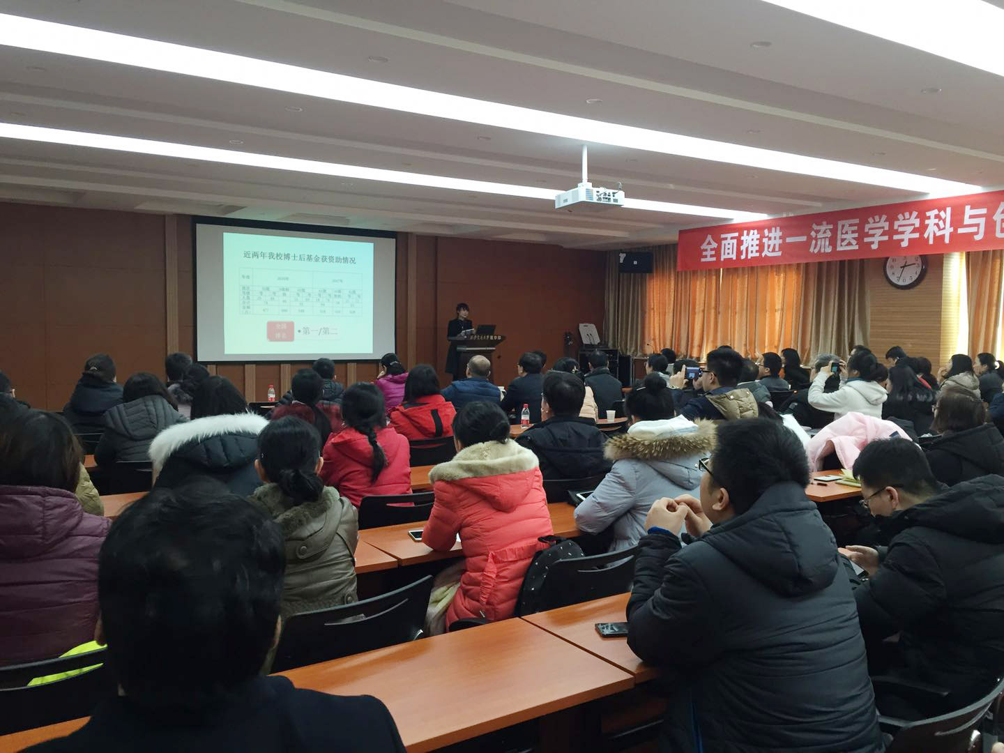 2018年1月11日下午,医学部在护理系多功能厅召开了2018年度博士后政策及项目申报宣讲专题报告会。学校人力资源部高宏副部长、博士后管理办公室贺睿主管及评审专家航天航空学院陈刚教授、机械工程学院罗钰博士后应邀分别做了专题报告。医学各院系负责人、流动站负责人、学科带头人及新讲师、博士后参加了宣讲会,会议由医学部36500365.com李艳芬副处长主持。